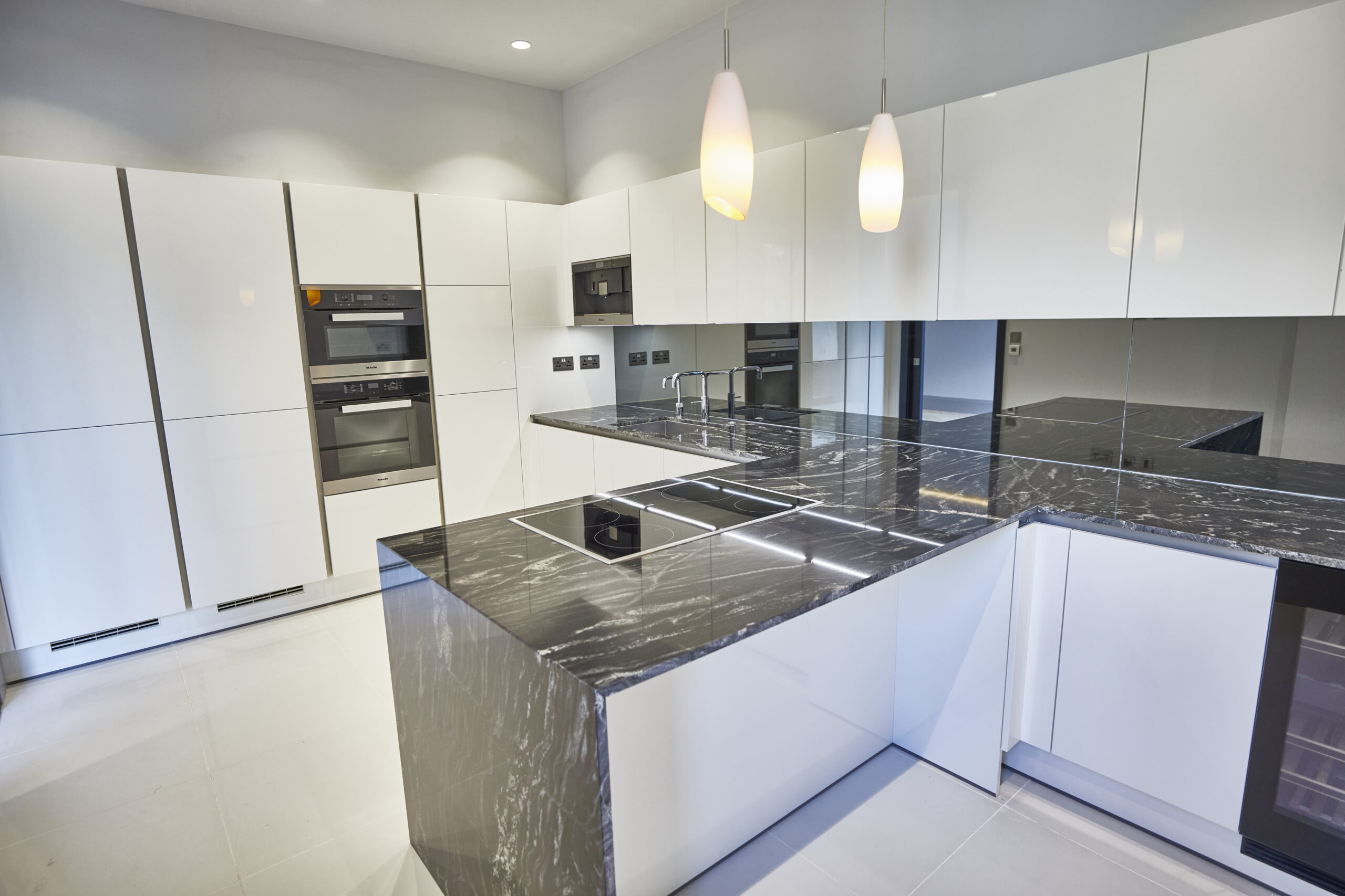 The delectable solid black marble kitchen island provides a focal point to the room, complemented on all sides by white lacquered kitchen units, leather seating and a wine cooler.