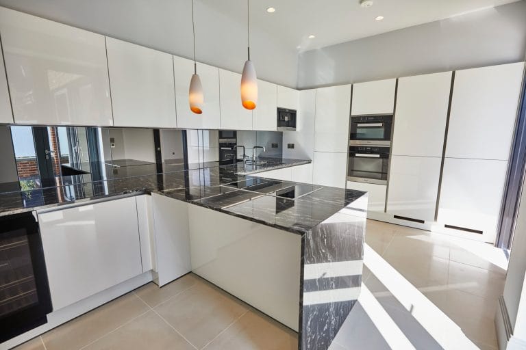 The delectable solid black marble kitchen island provides a focal point to the room, complemented on all sides by white lacquered kitchen units, leather seating and a wine cooler.