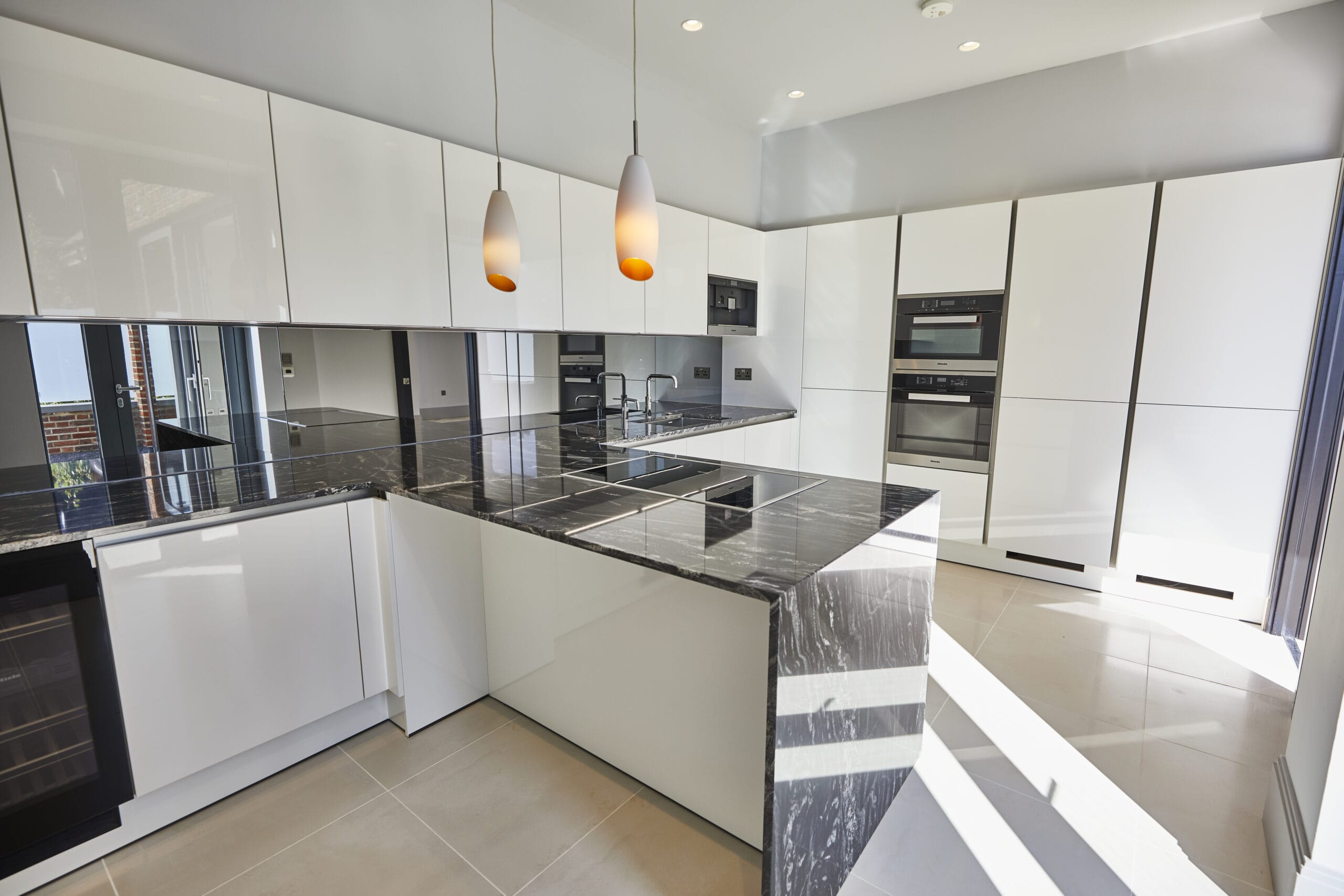 The delectable solid black marble kitchen island provides a focal point to the room, complemented on all sides by white lacquered kitchen units, leather seating and a wine cooler.