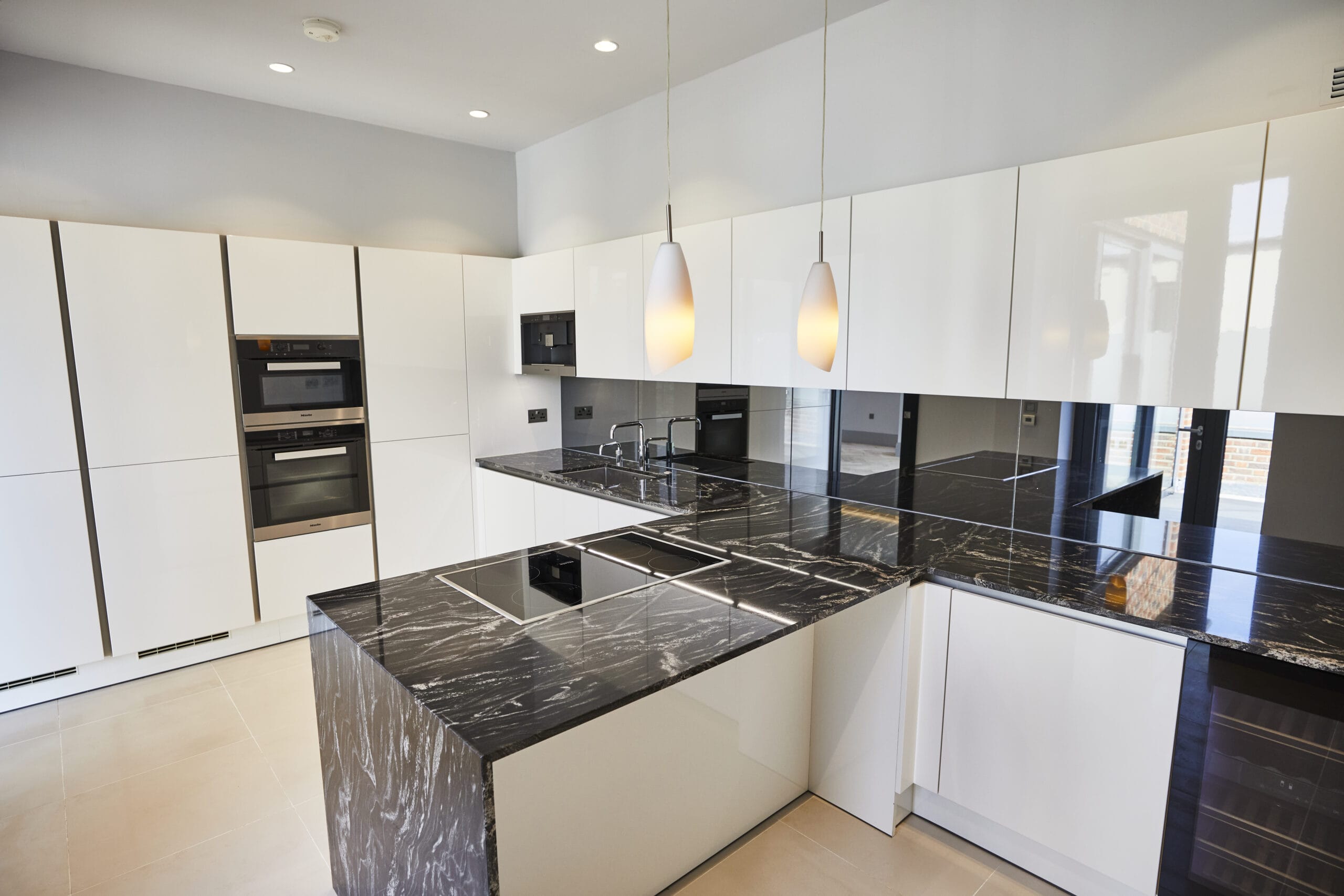 The delectable solid black marble kitchen island provides a focal point to the room, complemented on all sides by white lacquered kitchen units, leather seating and a wine cooler.